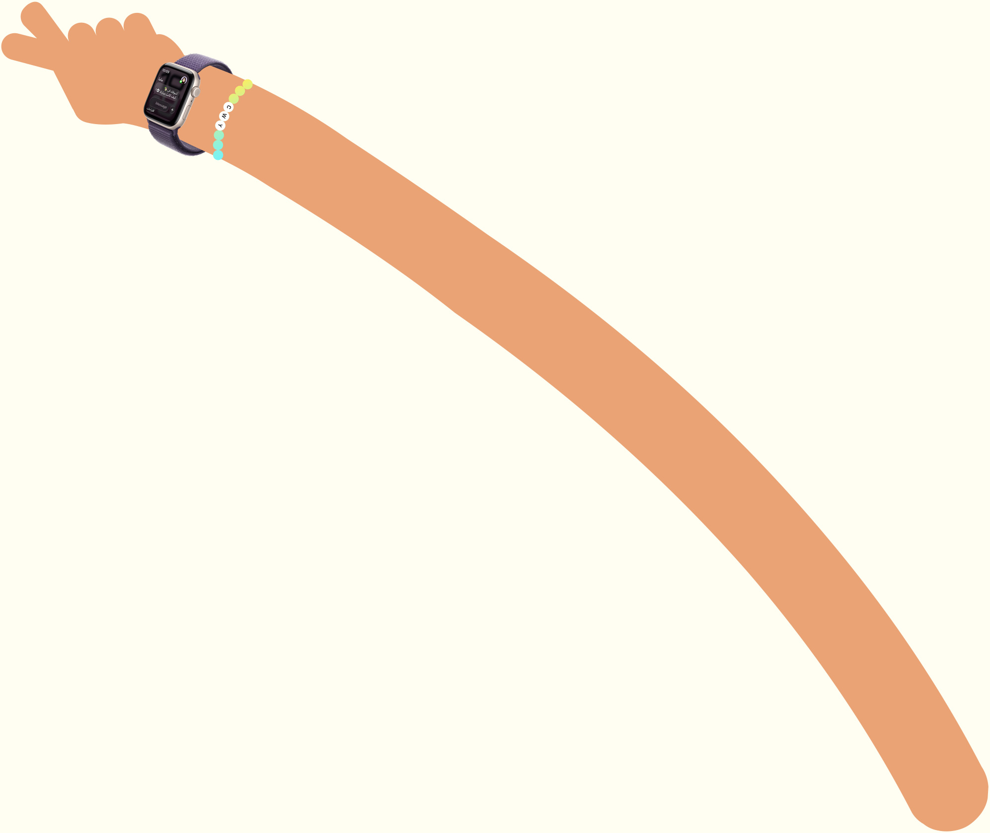 رسم توضيحي لمعصمي طفلين يرتديان ساعة Apple Watch SE 3، ويد شخص بالغ تحمل جهاز iPhone 17‏