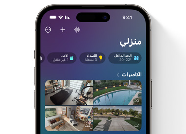 جهاز iPhone يعرض واجهة مستخدم تطبيق المنزل 'منزلي'