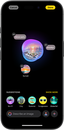 Create fun, original images with Image Playground right in your apps or its own dedicated app. You can try out styles like animation, illustration, and sketch and discover additional ChatGPT styles. Turn a rough sketch into a related image that complements your notes with Image Wand. Craft a custom memory movie in the Photos app. And make images inspired by your friends using Genmoji.