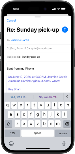 Use a Smart Reply in Mail to quickly draft an email response with all the right details. Apple Intelligence can identify questions you were asked in an email and offer relevant selections to include in your response. With a few taps you’re ready to send a reply with key questions answered.