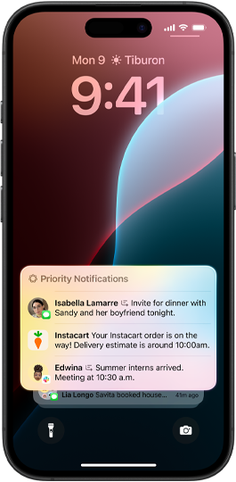Reduce Interruptions is a Focus that highlights notifications that might need immediate attention. Priority notifications appear at the top of the stack and are summarized, so you can see what matters most at a glance.