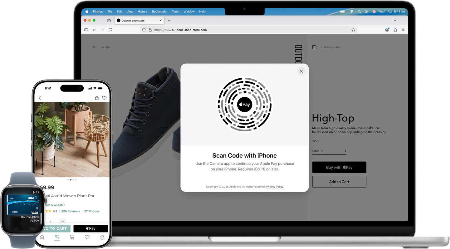 In apps and online. Use Apple Pay to seamlessly make purchases in Safari and other browsers — on iPhone, iPad, Mac and other computers — without the lengthy check-out forms. On an Apple device, click or tap the Apple Pay button and pay with a touch or glance. On a non-Apple device, scan the Apple Pay code with your iPhone camera and use your iPhone to complete your purchase.2 You can even use Apple Pay to subscribe to services like Apple Music, Apple News+ and Apple TV+, buy apps and games on the App Store, and upgrade your iCloud storage.