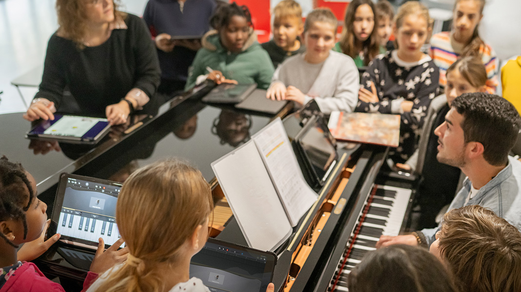 Leerkrachten brengen zo allerlei nieuwe manieren van leren naar het klaslokaal, en daarmee gaat er ook voor leerlingen een wereld aan nieuwe mogelijkheden open. Tijdens muzieklessen zitten de leerlingen rond een piano om hun eigen muziek te spelen en te schrijven met Apple Pencil en Pages. Anderen gebruiken GarageBand om hun eigen geluiden te creëren en op te nemen, terwijl klasgenoten een instrument bespelen. Bij programmeerlessen gebruiken leerlingen CoSpaces Edu op iPad om 3D‑creaties te maken, en Swift Playgrounds om te animeren in AR- en VR‑omgevingen.