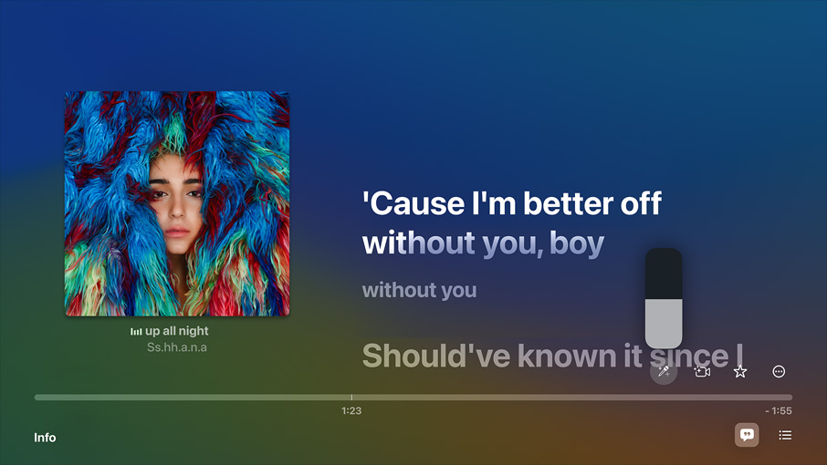 Listen to over 100 million songs, 30,000 playlists, and live radio on the big screen. You can even be your own video star with Apple Music Sing6 — sing top songs with real-time lyrics and adjustable vocals that let you take the lead, duet with the artist, or belt out backup harmonies.4