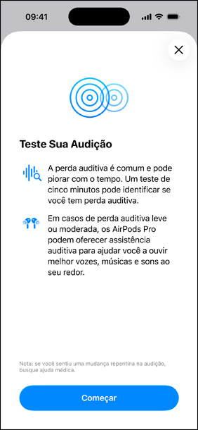 Ouça os tons, toque na tela. Aplicando a audiometria tonal liminar, com base em ciência acústica avançada, o teste reproduz uma série de tons aos quais você responde tocando na tela. Animações úteis, efeitos de tapback e indicadores de progresso guiam a experiência, que leva cerca de cinco minutos. Mais de 150 mil audiogramas reais e milhões de simulações ajudaram a desenvolver um Teste de Audição preciso, rápido e fácil.