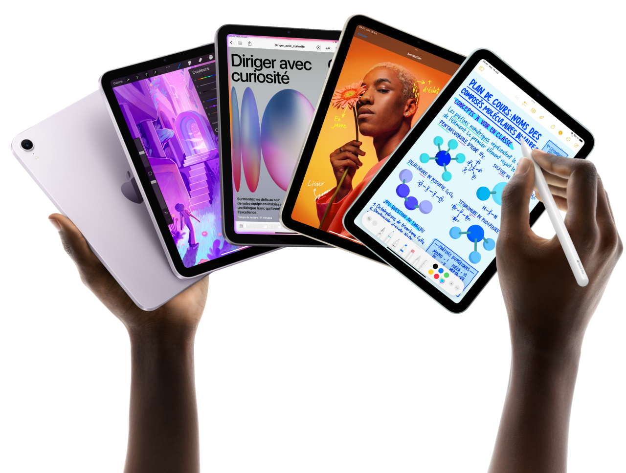 L’Apple Pencil redéfinit le dessin, la peinture, l’écriture manuscrite et la prise de notes avec une finesse et un naturel qui frôlent la magie2 : précision au pixel près, faible latence, sensibilité à l’inclinaison, prise en charge de la détection de la paume... Et avec l’Apple Pencil Pro, il y a plus de façons encore de donner vie à vos idées.