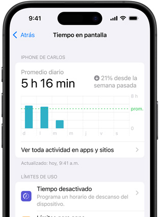 Tiempo en Pantalla te permite saber cuánto tiempo tú y tus hijos pasan usando apps, viendo sitios web o interactuando con los dispositivos en general. Puedes ver informes semanales, el tiempo de uso de una app en particular, la cantidad de notificaciones recibidas y las veces que se usó el dispositivo.
