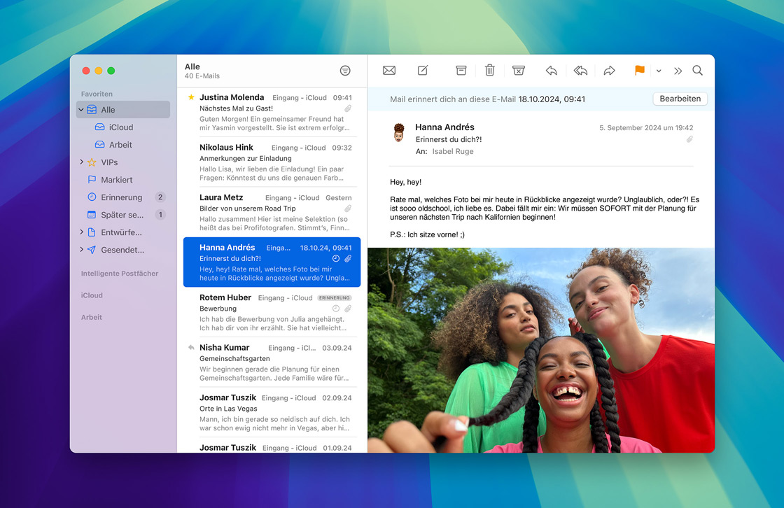 iCloud Mail ist nahtlos in die Mail App auf deinem iPhone, iPad oder Mac integriert und iCloud.com macht es einfach, von überall E‑Mails zu senden und zu empfangen. Sicherheits­features wie Schutz vor Spam und Antiphishing sind integriert, um Spam Mails zu erkennen und zu blockieren, bevor sie in deinem Post­eingang landen. Du kannst deine eigene @icloud.com E‑Mail Adresse ganz einfach einrichten. Mit einem iCloud+ Abo kannst du deine E‑Mail mit einer eigenen Domain personalisieren.