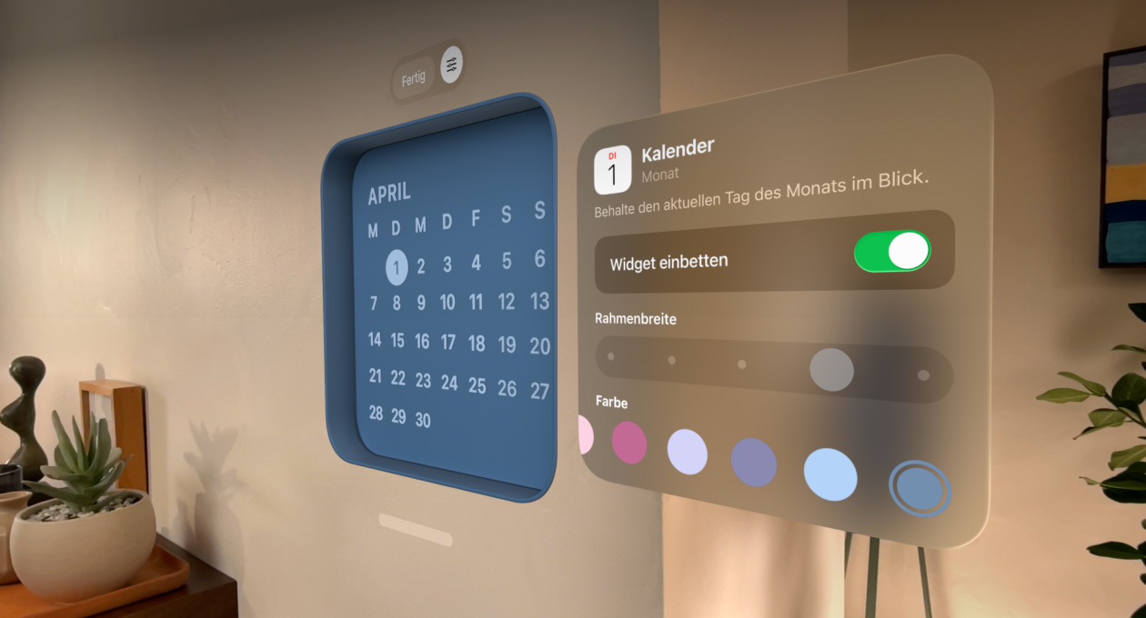 Behalte deine wichtigsten Widgets wie Fotos, Uhr, Music und Kalender immer im Blick. Passe die Dicke, Farbe und Tiefe ihrer Rahmen an, damit dein App Space jedes Mal so angeordnet ist, wie du es auf der Apple Vision Pro sehen willst.