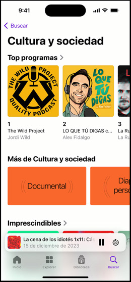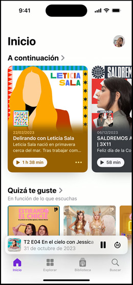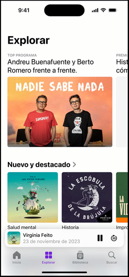 Todos los dispositivos Apple pueden reproducir podcasts en la app, así que tus voces preferidas te van a hacer compañía ya estés al volante, en el gimnasio o preparando la cena. Además, puedes descargar los programas a la biblioteca de Apple Podcasts para escucharlos sin conexión.