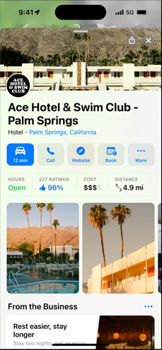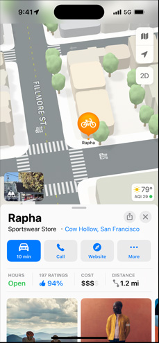 Avec Apple Business Connect, votre clientèle peut facilement vous trouver à l’aide de l’app Plans d’Apple. Gérez la façon dont votre entreprise est présentée en créant une fiche de lieu dans laquelle figurent l’itinéraire pour s’y rendre, vos coordonnées et des actions intégrées. Toutes les personnes qui, dans le monde entier, utilisent les appareils et les apps intégrées Apple pourront y accéder.