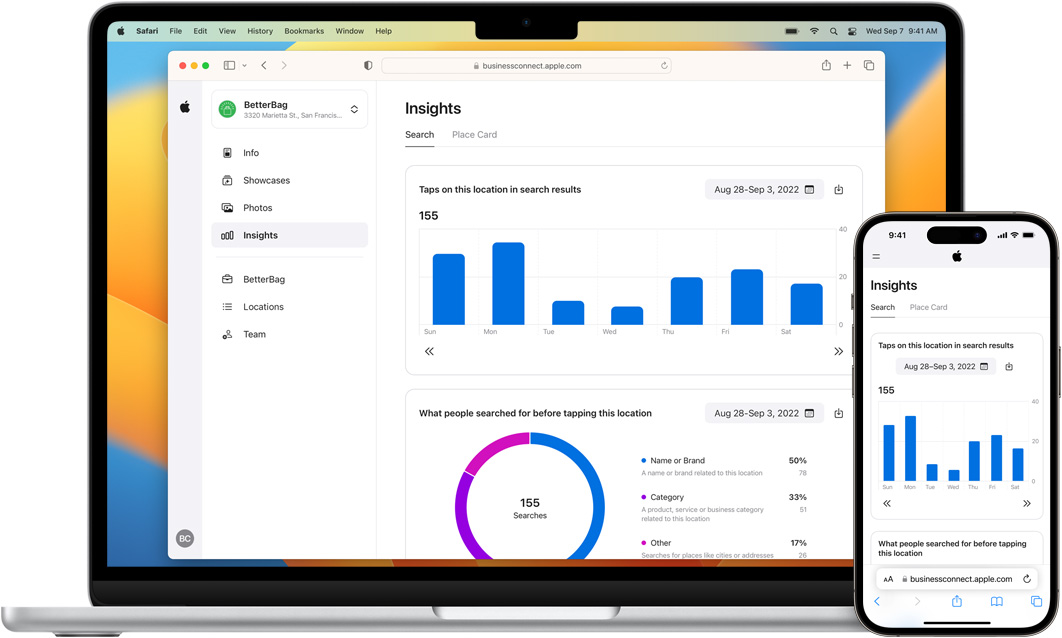 Grâce aux statistiques fournies par Apple, découvrez comment votre clientèle trouve votre fiche de lieu, accède à vos offres et interagit avec vos actions. Ensuite, ajustez‑les pour accroître encore votre impact.