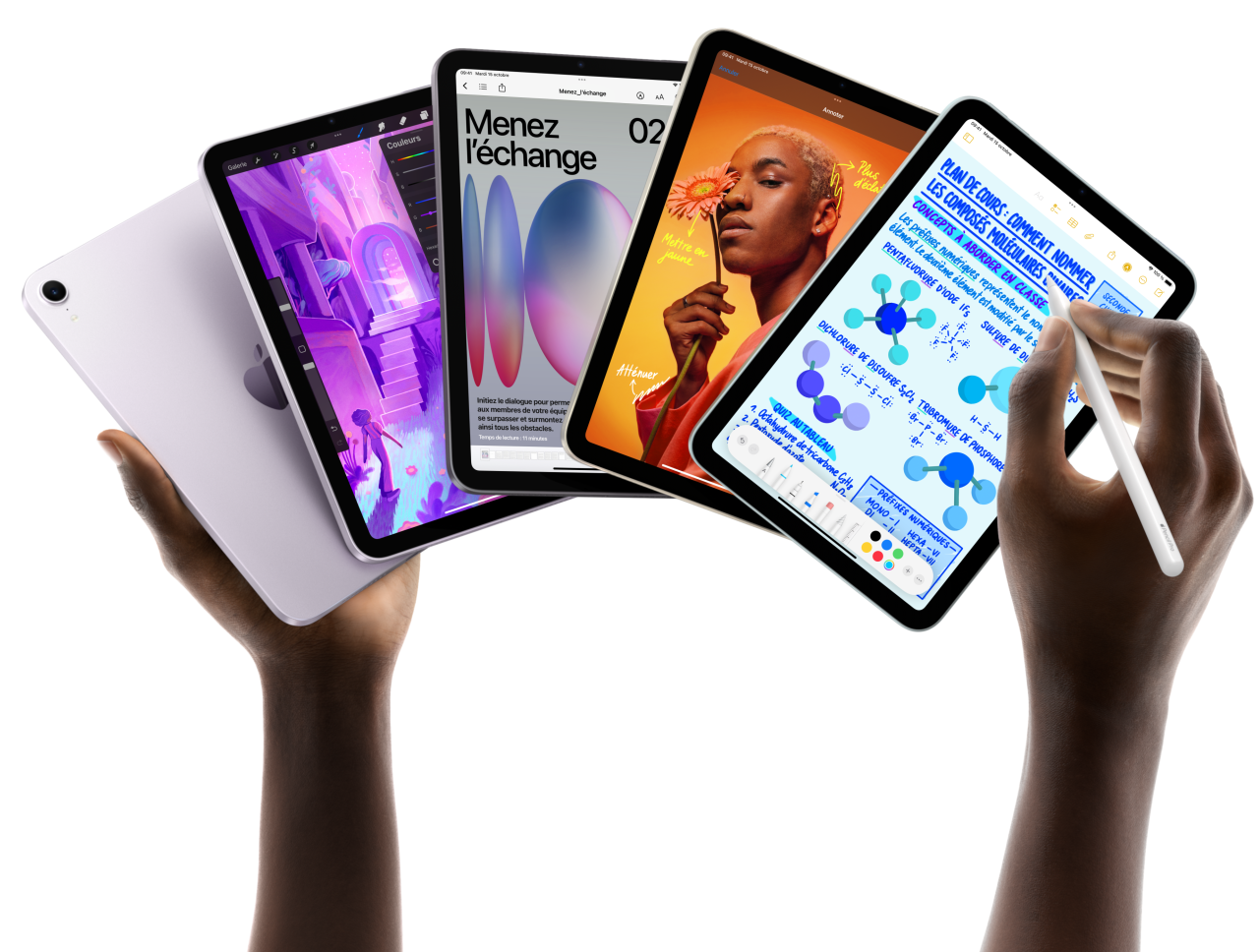 Cinq iPad mini tenus entre des mains, forment un éventail. Un modèle montre la caméra arrière, tandis que les quatre autres sont vus de face. Un Apple Pencil Pro est utilisé pour prendre des notes.