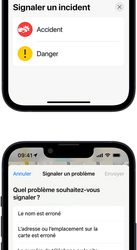 Les horaires d’ouverture de votre café préféré sont erronés ? Un vieux matelas gît en travers de la route ? Quel que soit le problème rencontré, vous pouvez facilement le signaler dans Plans. Actualisez les informations d’une entreprise et envoyez-les directement dans l’interface de sa fiche. Signalez rapidement un accident ou un danger avec Siri. Dites simplement « Il y a un accident » ou « Il y a quelque chose sur la route », et Siri se chargera de le déclarer. Si un incident affiché sur la carte a été résolu, vous pouvez également le signaler – tout en gardant les mains libres et en vous concentrant sur votre conduite.