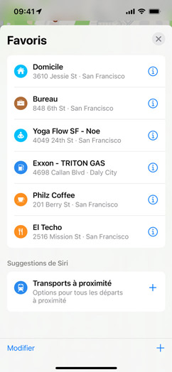 Ouvrez Plans et touchez la photo de votre compte en bas de l’écran pour afficher en un seul et même endroit vos réglages les plus utilisés – comme votre mode de transport préféré, vos signalements et vos favoris. Lorsque vous ouvrez Plans sur vos appareils ou sur votre tableau de bord avec CarPlay, l’app affiche les endroits où vous vous rendez le plus. Vous savez donc, d’un simple geste, comment vous rendre chez vous, au travail, à la salle de sport, à l’école de votre enfant, à la station-service la plus proche ou à votre restaurant fétiche.
