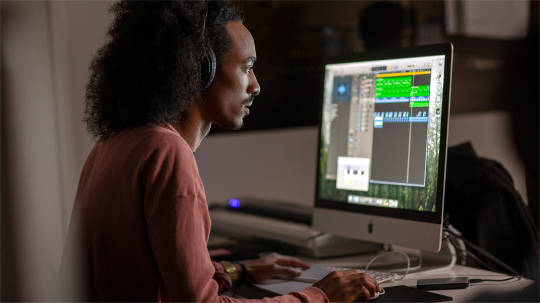 MacBook Pro. Alat profesional serba bisa yang dipercaya Hughes untuk mempersiapkan calon kreator dan produser pemula menuju karier yang sukses. Logic Pro di Mac menjadi fondasi untuk seluruh kurikulum desain musik dan suara. Mahasiswa belajar merekam, mengedit, dan menggabungkan segala macam musik dengan palet suara tingkat profesional, serta membuat portofolio setara profesional untuk mempersiapkan diri di industri musik.