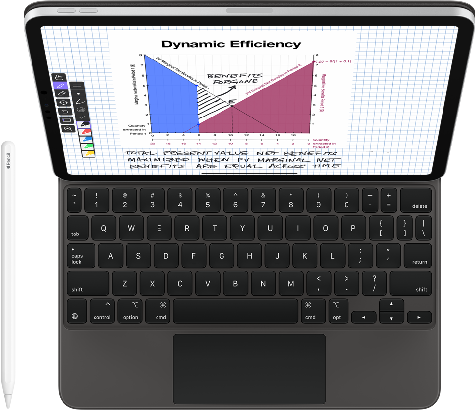 iPad Pro e Apple Pencil. La professoressa Gopalakrishnan usa Explain Everything Whiteboard su iPad per registrare le sue lezioni di economia dell’ambiente, scomporre tabelle e grafici astratti, e mostrare in tempo reale come risolvere problemi matematici complessi.