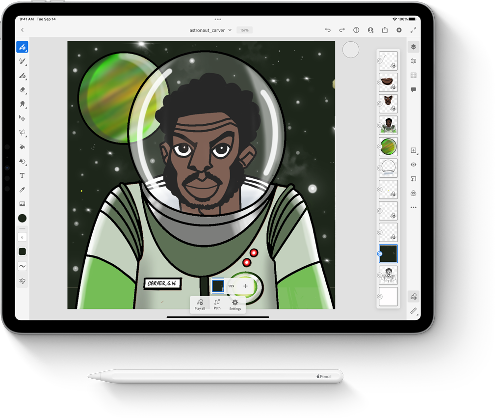 iPad ProとApple Pencil。AppleのテクノロジーはMance氏のデジタルアートのキャンバスの原動力です。万能なiPadはイラスト制作、プレゼンテーション、指導にもぴったりです。Apple Pencilは精度が高く、自然に使えるので、Adobe Frescoアプリでインスピレーションを与えるようなキャラクターを描き、彩色する方法をスムーズに教えることができ