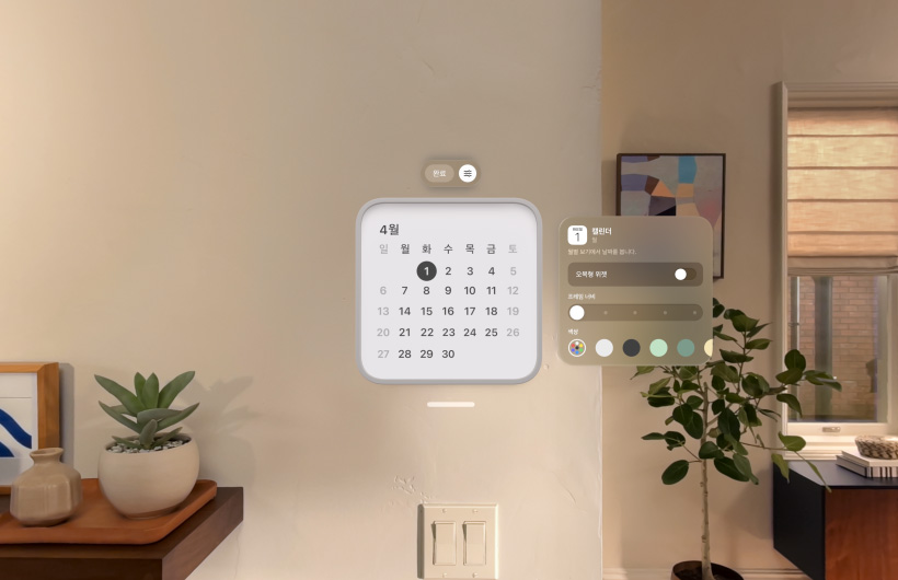 위젯 기능을 활용해 ‘사진’, ‘시계’, ‘음악’, ‘캘린더’와 같이 즐겨 찾는 정보와 앱을 당신이 딱 원하는 방식으로 공간에 배치할 수 있습니다. 위젯의 프레임 두께, 색상, 깊이를 커스터마이징할 수 있고, Apple Vision Pro를 착용할 때마다 당신이 놓아둔 곳에서 그 위젯들을 찾을 수 있습니다.