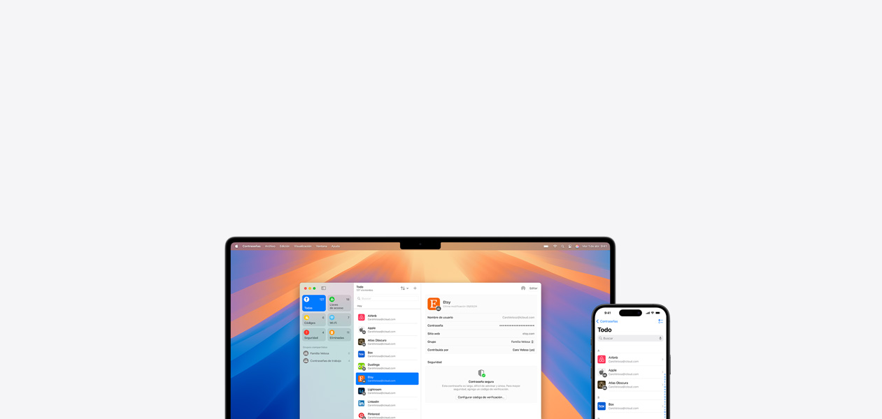 La app Contraseñas te permite acceder a contraseñas, llaves de acceso, contraseñas de Wi‑Fi y códigos de verificación en un solo lugar. También te ayuda a gestionar tus credenciales en todos tus dispositivos con iCloud y te avisa si una contraseña no es lo suficientemente segura. Además, puedes crear, guardar y personalizar contraseñas seguras, compartirlas con otras personas y mucho más.