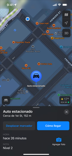Al elegir un destino, la tarjeta interactiva te mostrará al instante todo lo que necesitas saber acerca del lugar, como la dirección, los horarios, el sitio web y el número de teléfono. También puedes consultar detalles como rangos de precios, fotos, métodos de pago aceptados e incluso si puedes llevar a tu perro. Con Flyover, puedes hacerte una idea de la ubicación y los alrededores. Incluso puedes rentar una bicicleta de forma rápida y segura, pagar el estacionamiento, pedir comida y mucho más con sólo un toque.