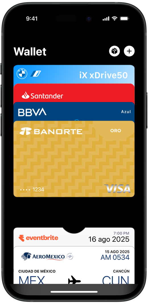 La app Wallet está en tu iPhone para que puedas guardar de forma segura y en un solo lugar tus tarjetas de débito y crédito, pases de abordar, boletos y más. Además, funciona con el iPhone y el Apple Watch, para que tengas a la mano muchas más cosas, llevando encima
