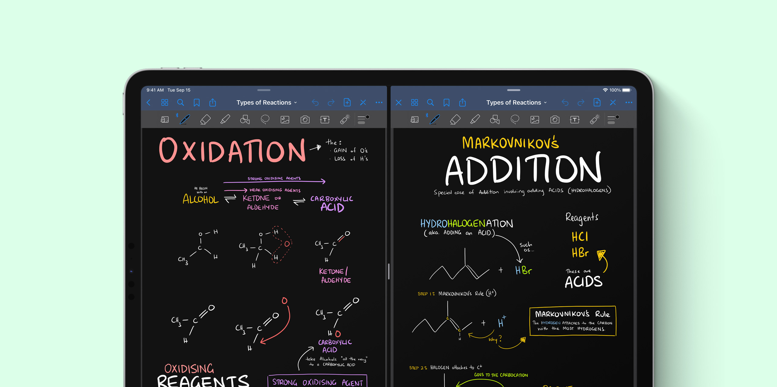 The versatility of iPad supports Samuel’s varied learning style. He multitasks across apps with Split View, uses Apple Pencil to create notes with detailed diagrams, and relies on apps like Goodnotes to bring it all together in beautiful personalised study guides that help crystallise what he’s learning.