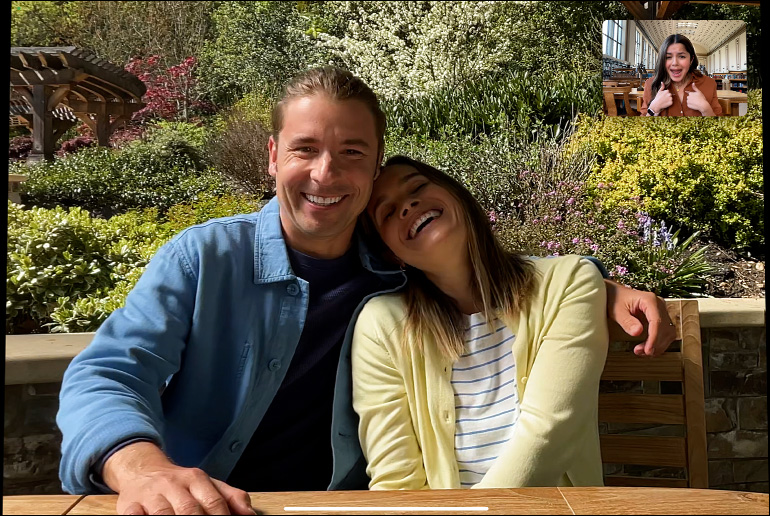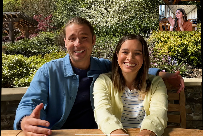 iPad Air, front exterior, user is on FaceTime and looking at Keynote in front of another iPad Air, back exterior