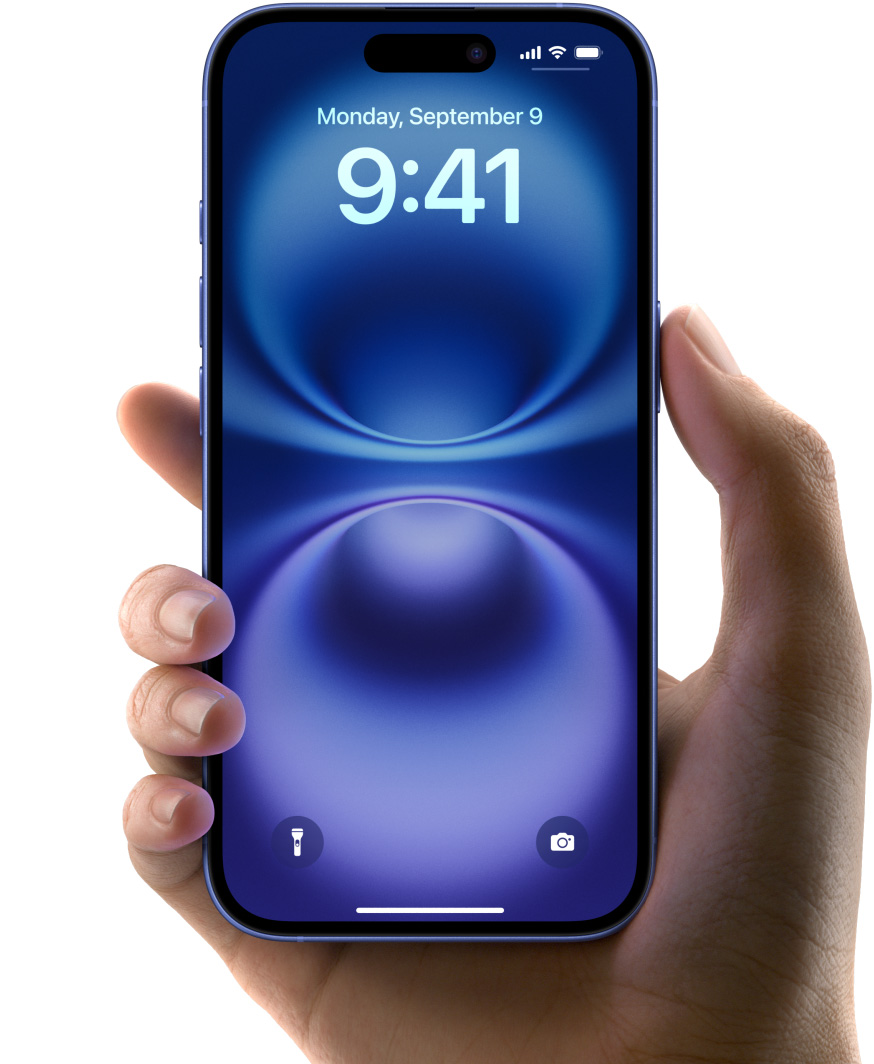 A hand holds iPhone 16 in Ultramarine, all screen display, Dynamic Island centered near top, rounded corners
