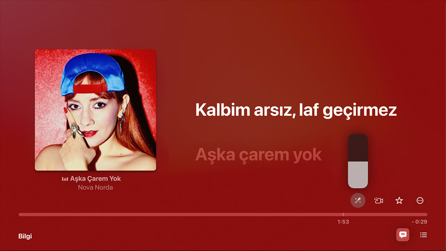 100 milyondan fazla şarkıyı, 30 binden fazla çalma listesini ve canlı radyo yayınlarını büyük ekranda dinleyin. Hatta Apple Music Şarkı Söyle5 özelliğiyle evinizdeki sahnenin yıldızı siz olun — gerçek zamanlı şarkı sözleri ve ayarlanabilir vokallerle en çok dinlenen şarkıları solist veya vokalist olarak ya da sanatçıyla düet yaparak söyleyin.4