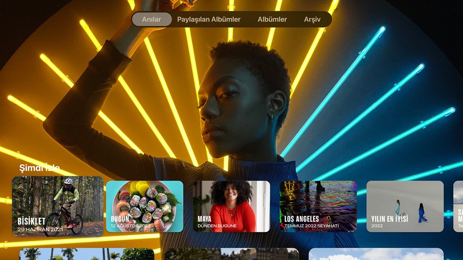 Fotoğraflar. iCloud Paylaşılan Fotoğraf Arşivi, ailenizdeki herkesin diğer aile üyelerinin fotoğraflarına erişmesini kolaylaştırıyor. Üstelik tüm bu içerikleri TV’nizde görüntüleyebiliyorsunuz. Ve Anılar’ı ekran koruyucunuz olarak seçebiliyor, en güzel anlarınızın büyük ekranda hayat bulmasını izleyebiliyorsunuz.