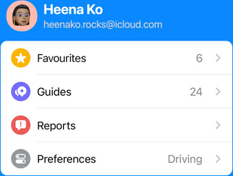 Open Maps and tap your user account photo at the bottom of the screen to see your most used settings — like preferred mode of transport, reported issues and favourites — all in one place. And when you open Maps on your devices or on your dashboard with CarPlay, it displays the places you visit most — so you’re always just a tap away from home, work, the gym, your kid’s school, the nearest petrol station or your favourite restaurant.