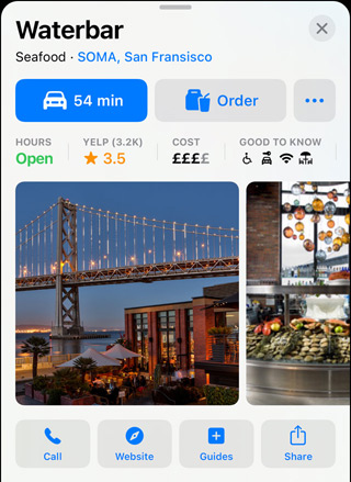 Choose a destination, and its interactive place card shows you everything you need at a glance. See basics like address, opening hours, website and phone number, along with details like price range, photo galleries, associated Guides, accepted payment types — even whether you can take your dog. Launch Flyover or Look Around to get a sense of the location and surroundings. You can even quickly and securely rent a bike, pay for parking, order food and more with just a tap.